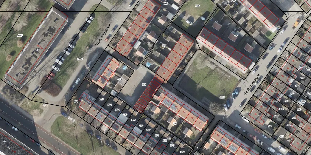 Het perceel waarop Visseringstraat 38-GR01 staat heeft een oppervlakte van 612 m². Dit is een groot perceel. De perceeloppervlakte wordt geregistreerd door het Kadaster. Gedetailleerde informatie over de maten van dit perceel kunt u vinden in het rapport Kadastrale kaart met maatvoering van Visseringstraat 38-GR01.