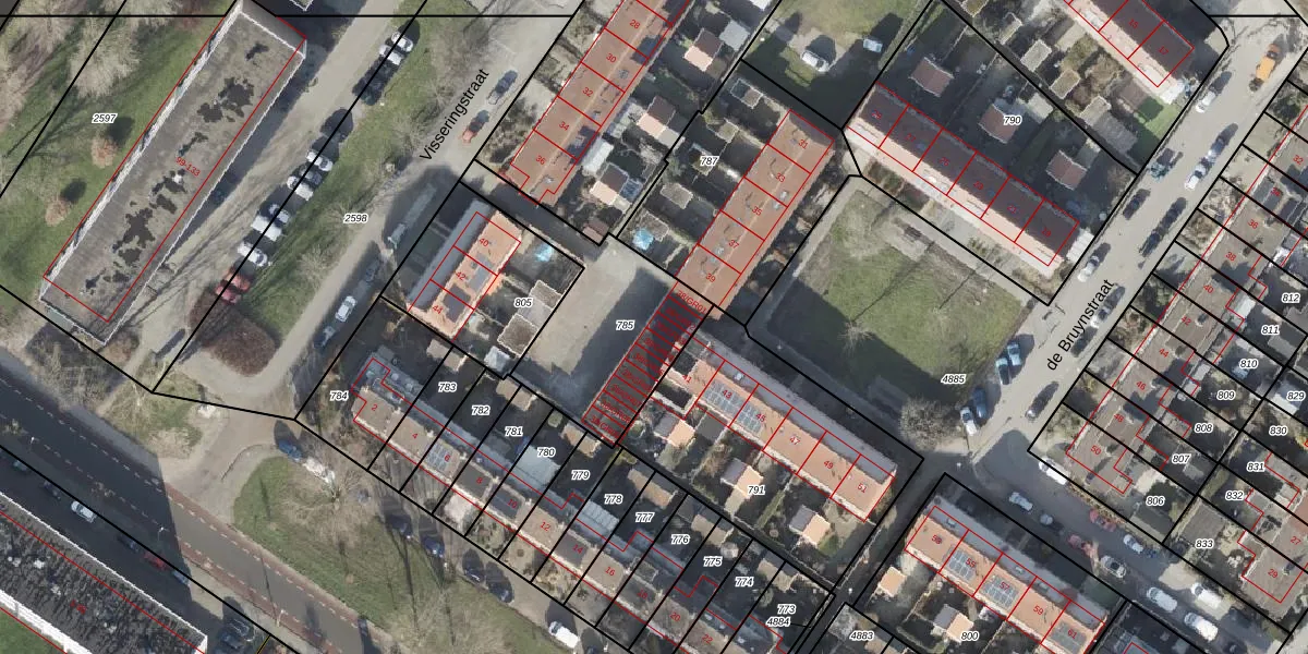Het perceel waarop Visseringstraat 38-GR03 staat heeft een oppervlakte van 612 m². Dit is een groot perceel. De perceeloppervlakte wordt geregistreerd door het Kadaster. Gedetailleerde informatie over de maten van dit perceel kunt u vinden in het rapport Kadastrale kaart met maatvoering van Visseringstraat 38-GR03.