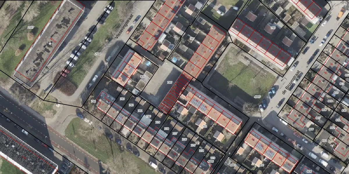 Het perceel waarop Visseringstraat 38-GR04 staat heeft een oppervlakte van 612 m². Dit is een groot perceel. De perceeloppervlakte wordt geregistreerd door het Kadaster. Gedetailleerde informatie over de maten van dit perceel kunt u vinden in het rapport Kadastrale kaart met maatvoering van Visseringstraat 38-GR04.