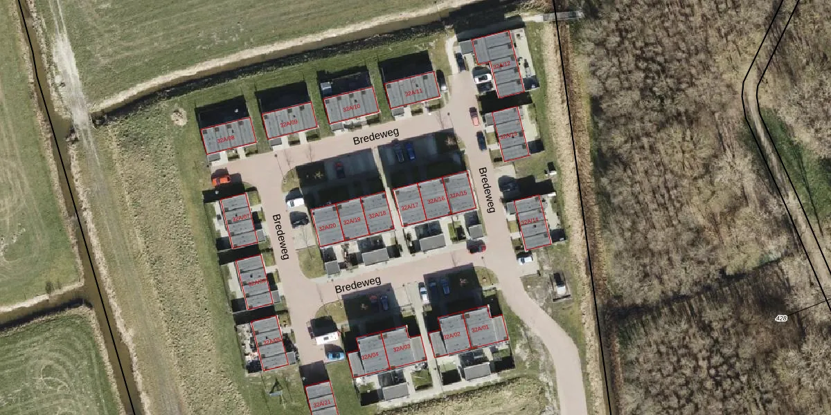Het perceel waarop Bredeweg 32-A-17 staat heeft een oppervlakte van 5,2 ha. Dit is een zeer groot perceel. De perceeloppervlakte wordt geregistreerd door het Kadaster. Gedetailleerde informatie over de maten van dit perceel kunt u vinden in het rapport Kadastrale kaart met maatvoering van Bredeweg 32-A-17.