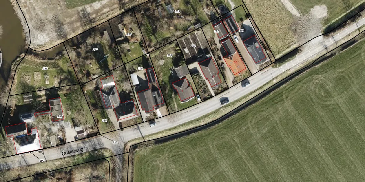 Het perceel waarop Oosterweg 9 staat heeft een oppervlakte van 645 m². Dit is een groot perceel. De perceeloppervlakte wordt geregistreerd door het Kadaster. Gedetailleerde informatie over de maten van dit perceel kunt u vinden in het rapport Kadastrale kaart met maatvoering van Oosterweg 9.