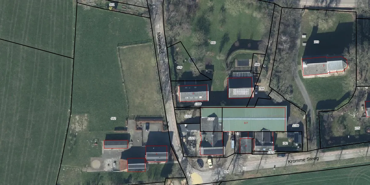 Het perceel waarop Moleneind 1 staat heeft een oppervlakte van 2980 m². Dit is een zeer groot perceel. De perceeloppervlakte wordt geregistreerd door het Kadaster. Gedetailleerde informatie over de maten van dit perceel kunt u vinden in het rapport Kadastrale kaart met maatvoering van Moleneind 1.