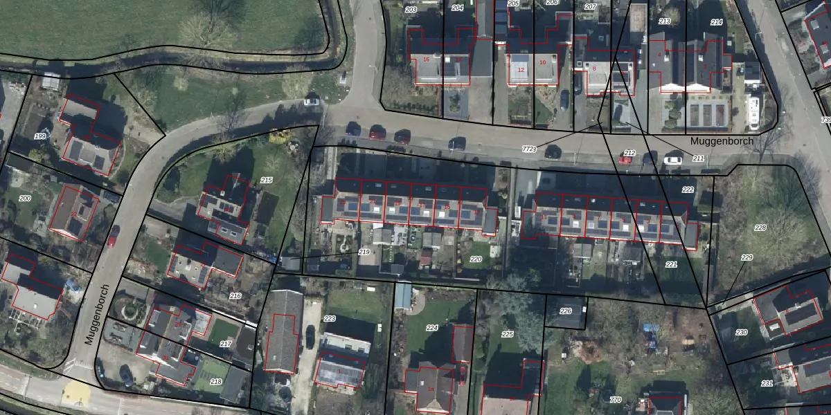 Het perceel waarop Muggenborch 17 staat heeft een oppervlakte van 2465 m². Dit is een zeer groot perceel. De perceeloppervlakte wordt geregistreerd door het Kadaster. Gedetailleerde informatie over de maten van dit perceel kunt u vinden in het rapport Kadastrale kaart met maatvoering van Muggenborch 17.