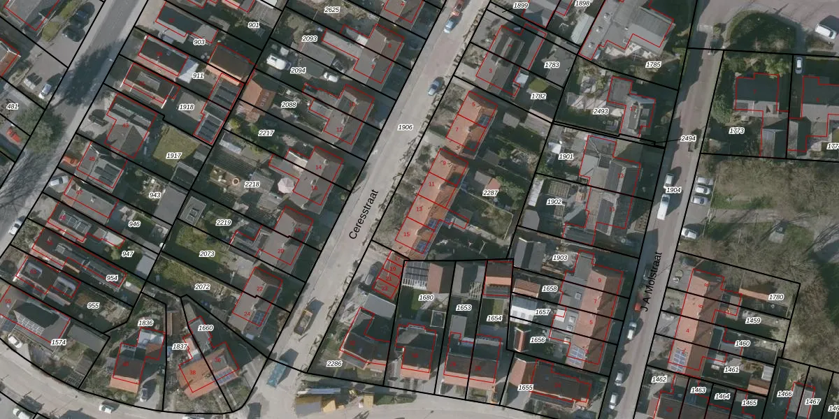 Het perceel waarop Ceresstraat 13 staat heeft een oppervlakte van 1181 m². Dit is een zeer groot perceel. De perceeloppervlakte wordt geregistreerd door het Kadaster. Gedetailleerde informatie over de maten van dit perceel kunt u vinden in het rapport Kadastrale kaart met maatvoering van Ceresstraat 13.