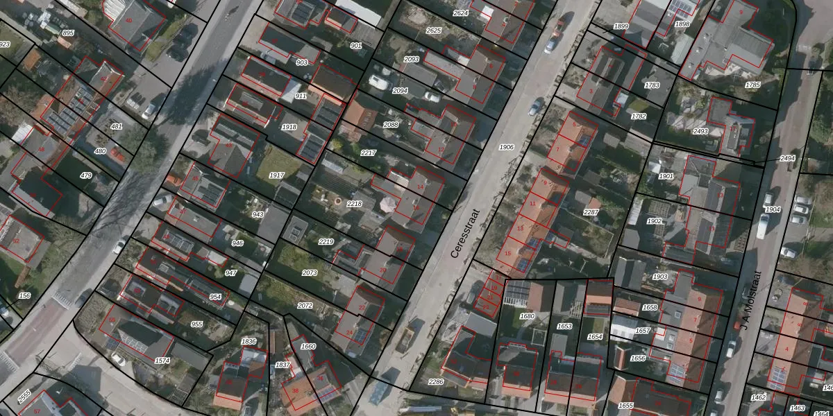 Het perceel waarop Ceresstraat 16 staat heeft een oppervlakte van 562 m². Dit is een groot perceel. De perceeloppervlakte wordt geregistreerd door het Kadaster. Gedetailleerde informatie over de maten van dit perceel kunt u vinden in het rapport Kadastrale kaart met maatvoering van Ceresstraat 16.