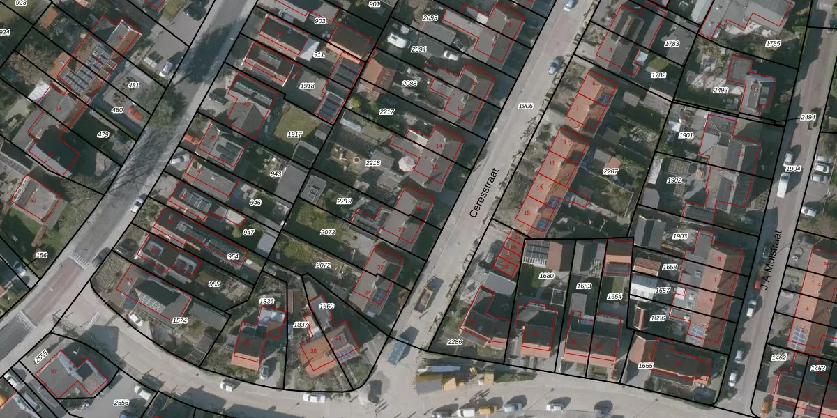 Het perceel waarop Ceresstraat 18 staat heeft een oppervlakte van 562 m². Dit is een groot perceel. De perceeloppervlakte wordt geregistreerd door het Kadaster. Gedetailleerde informatie over de maten van dit perceel kunt u vinden in het rapport Kadastrale kaart met maatvoering van Ceresstraat 18.