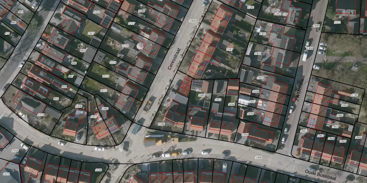 Het perceel waarop Ceresstraat 23 staat heeft een oppervlakte van 450 m². Dit is een groot perceel. De perceeloppervlakte wordt geregistreerd door het Kadaster. Gedetailleerde informatie over de maten van dit perceel kunt u vinden in het rapport Kadastrale kaart met maatvoering van Ceresstraat 23.
