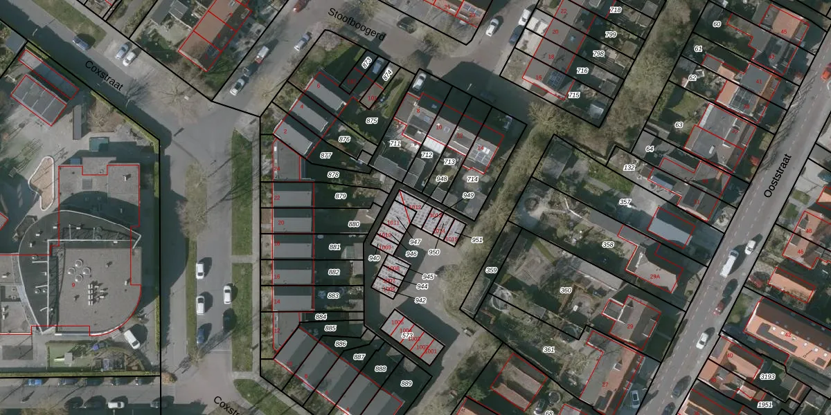 Het perceel waarop Coxstraat 1012 staat heeft een oppervlakte van 35 m². Dit is een klein perceel. De perceeloppervlakte wordt geregistreerd door het Kadaster. Gedetailleerde informatie over de maten van dit perceel kunt u vinden in het rapport Kadastrale kaart met maatvoering van Coxstraat 1012.
