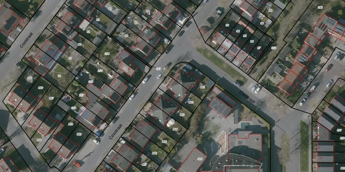 Het perceel waarop Coxstraat 13 staat heeft een oppervlakte van 234 m². Dit is een middelgroot perceel. De perceeloppervlakte wordt geregistreerd door het Kadaster. Gedetailleerde informatie over de maten van dit perceel kunt u vinden in het rapport Kadastrale kaart met maatvoering van Coxstraat 13.