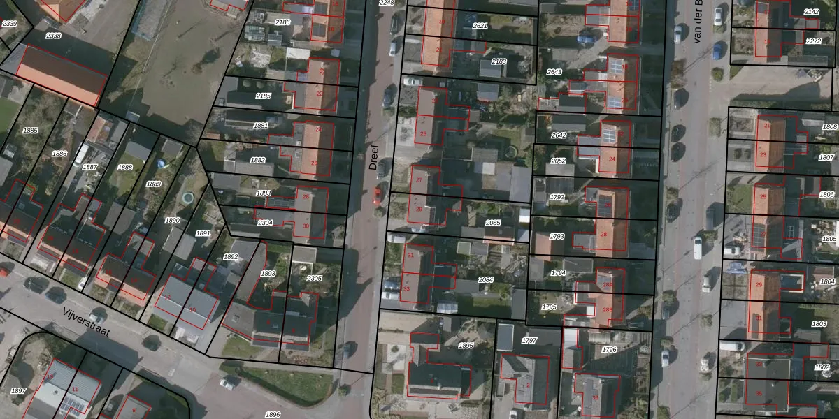Het perceel waarop Dreef 29 staat heeft een oppervlakte van 323 m². Dit is een groot perceel. De perceeloppervlakte wordt geregistreerd door het Kadaster. Gedetailleerde informatie over de maten van dit perceel kunt u vinden in het rapport Kadastrale kaart met maatvoering van Dreef 29.
