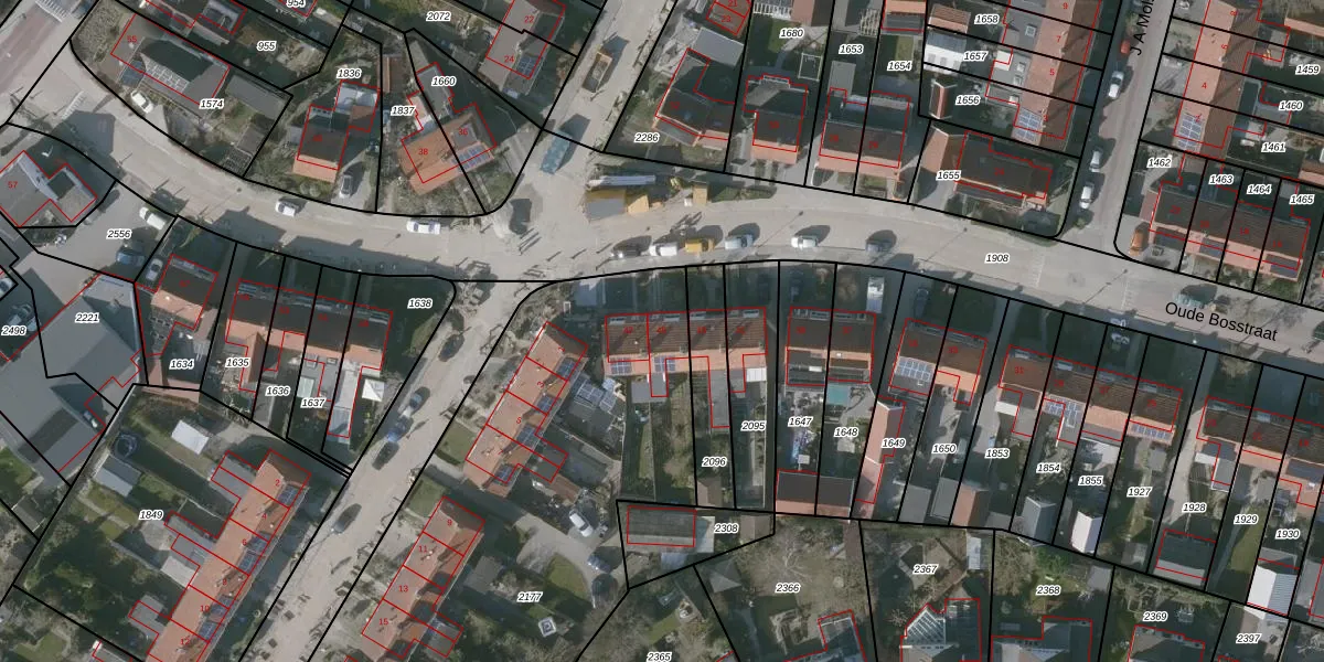 Het perceel waarop Oude Bosstraat 45 staat heeft een oppervlakte van 2746 m². Dit is een zeer groot perceel. De perceeloppervlakte wordt geregistreerd door het Kadaster. Gedetailleerde informatie over de maten van dit perceel kunt u vinden in het rapport Kadastrale kaart met maatvoering van Oude Bosstraat 45.