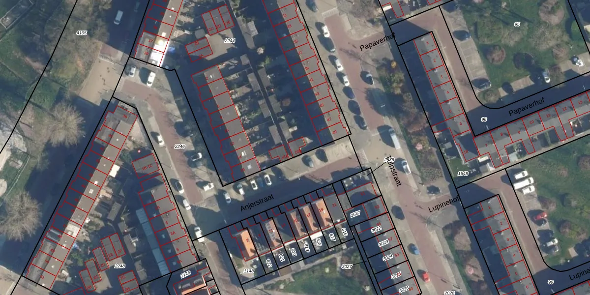 Het perceel waarop Anjerstraat 16-B staat heeft een oppervlakte van 4061 m². Dit is een zeer groot perceel. De perceeloppervlakte wordt geregistreerd door het Kadaster. Gedetailleerde informatie over de maten van dit perceel kunt u vinden in het rapport Kadastrale kaart met maatvoering van Anjerstraat 16-B.