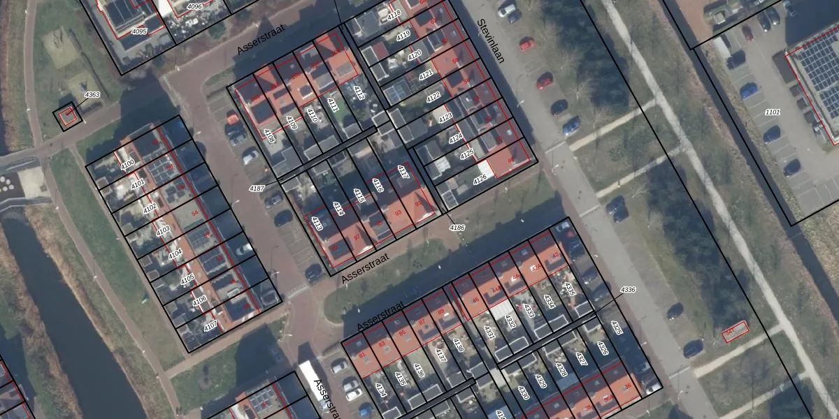 Het perceel waarop Asserstraat 91 staat heeft een oppervlakte van 182 m². Dit is een middelgroot perceel. De perceeloppervlakte wordt geregistreerd door het Kadaster. Gedetailleerde informatie over de maten van dit perceel kunt u vinden in het rapport Kadastrale kaart met maatvoering van Asserstraat 91.