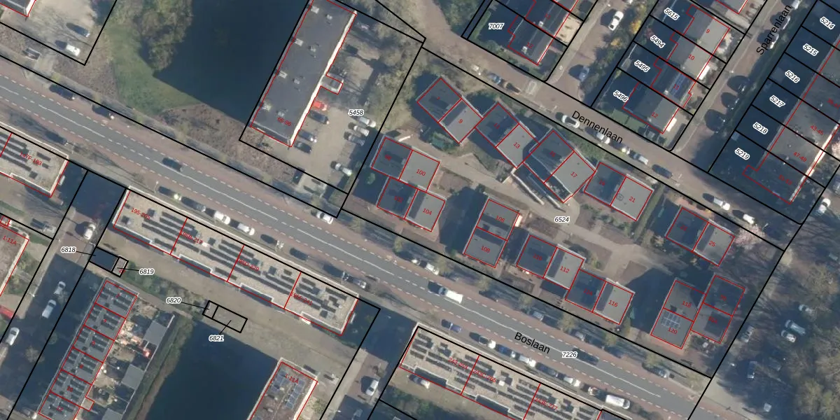 Het perceel waarop Boslaan 104 staat heeft een oppervlakte van 3815 m². Dit is een zeer groot perceel. De perceeloppervlakte wordt geregistreerd door het Kadaster. Gedetailleerde informatie over de maten van dit perceel kunt u vinden in het rapport Kadastrale kaart met maatvoering van Boslaan 104.