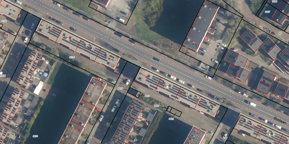 Het perceel waarop Boslaan 197 staat heeft een oppervlakte van 8974 m². Dit is een zeer groot perceel. De perceeloppervlakte wordt geregistreerd door het Kadaster. Gedetailleerde informatie over de maten van dit perceel kunt u vinden in het rapport Kadastrale kaart met maatvoering van Boslaan 197.