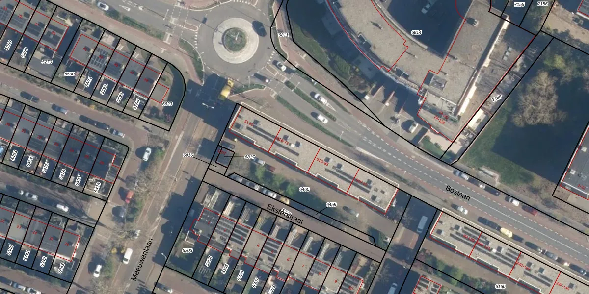 Het perceel waarop Boslaan 65 staat heeft een oppervlakte van 1333 m². Dit is een zeer groot perceel. De perceeloppervlakte wordt geregistreerd door het Kadaster. Gedetailleerde informatie over de maten van dit perceel kunt u vinden in het rapport Kadastrale kaart met maatvoering van Boslaan 65.