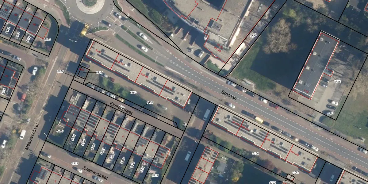 Het perceel waarop Boslaan 95 staat heeft een oppervlakte van 1333 m². Dit is een zeer groot perceel. De perceeloppervlakte wordt geregistreerd door het Kadaster. Gedetailleerde informatie over de maten van dit perceel kunt u vinden in het rapport Kadastrale kaart met maatvoering van Boslaan 95.