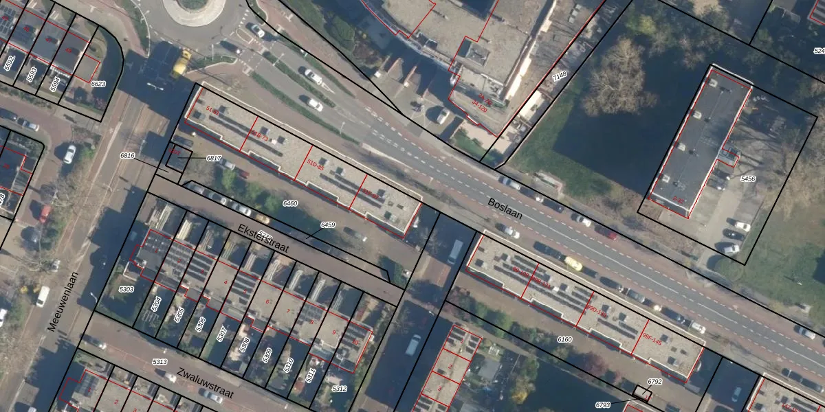 Het perceel waarop Boslaan 97 staat heeft een oppervlakte van 1333 m². Dit is een zeer groot perceel. De perceeloppervlakte wordt geregistreerd door het Kadaster. Gedetailleerde informatie over de maten van dit perceel kunt u vinden in het rapport Kadastrale kaart met maatvoering van Boslaan 97.