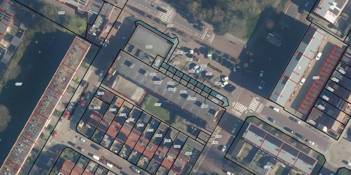 Het perceel waarop Bosplein 14 staat heeft een oppervlakte van 1618 m². Dit is een zeer groot perceel. De perceeloppervlakte wordt geregistreerd door het Kadaster. Gedetailleerde informatie over de maten van dit perceel kunt u vinden in het rapport Kadastrale kaart met maatvoering van Bosplein 14.