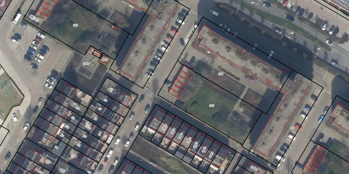 Het perceel waarop Conradstraat 55-B staat heeft een oppervlakte van 1240 m². Dit is een zeer groot perceel. De perceeloppervlakte wordt geregistreerd door het Kadaster. Gedetailleerde informatie over de maten van dit perceel kunt u vinden in het rapport Kadastrale kaart met maatvoering van Conradstraat 55-B.