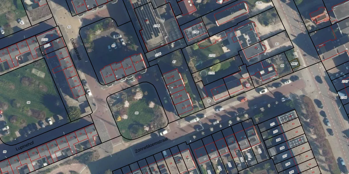 Het perceel waarop Dahliastraat 20-D staat heeft een oppervlakte van 600 m². Dit is een groot perceel. De perceeloppervlakte wordt geregistreerd door het Kadaster. Gedetailleerde informatie over de maten van dit perceel kunt u vinden in het rapport Kadastrale kaart met maatvoering van Dahliastraat 20-D.