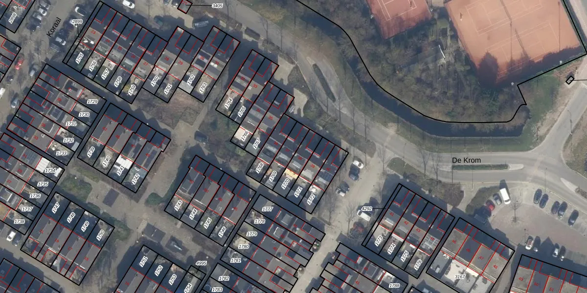 Het perceel waarop De Krom 37 staat heeft een oppervlakte van 125 m². Dit is een middelgroot perceel. De perceeloppervlakte wordt geregistreerd door het Kadaster. Gedetailleerde informatie over de maten van dit perceel kunt u vinden in het rapport Kadastrale kaart met maatvoering van De Krom 37.