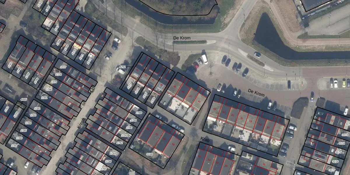 Het perceel waarop De Krom 45 staat heeft een oppervlakte van 483 m². Dit is een groot perceel. De perceeloppervlakte wordt geregistreerd door het Kadaster. Gedetailleerde informatie over de maten van dit perceel kunt u vinden in het rapport Kadastrale kaart met maatvoering van De Krom 45.