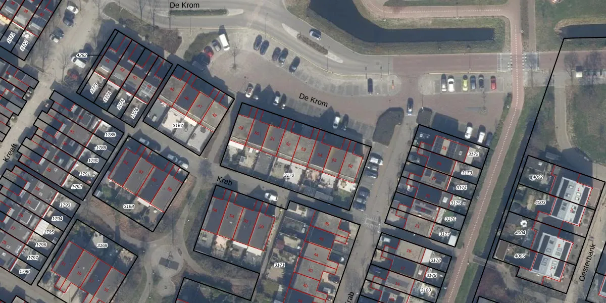 Het perceel waarop De Krom 53 staat heeft een oppervlakte van 995 m². Dit is een groot perceel. De perceeloppervlakte wordt geregistreerd door het Kadaster. Gedetailleerde informatie over de maten van dit perceel kunt u vinden in het rapport Kadastrale kaart met maatvoering van De Krom 53.