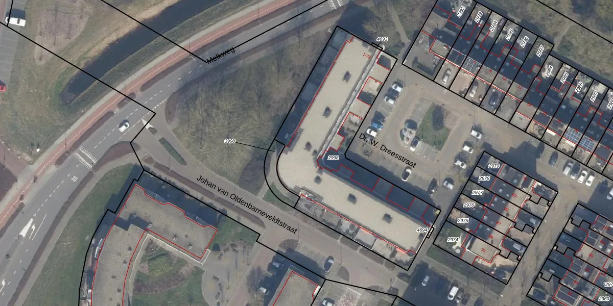 Het perceel waarop Dr. W. Dreesstraat 25 staat heeft een oppervlakte van 2005 m². Dit is een zeer groot perceel. De perceeloppervlakte wordt geregistreerd door het Kadaster. Gedetailleerde informatie over de maten van dit perceel kunt u vinden in het rapport Kadastrale kaart met maatvoering van Dr. W. Dreesstraat 25.