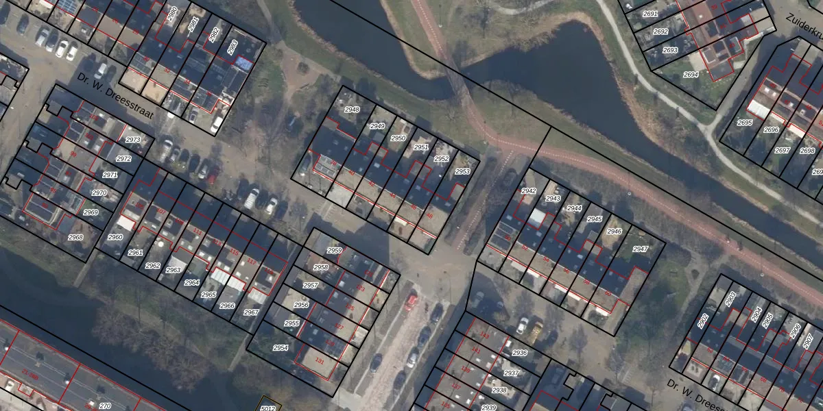 Gebruik de zoekbalk of klik op een perceel voor informatie over de adressen binnen dit perceel.