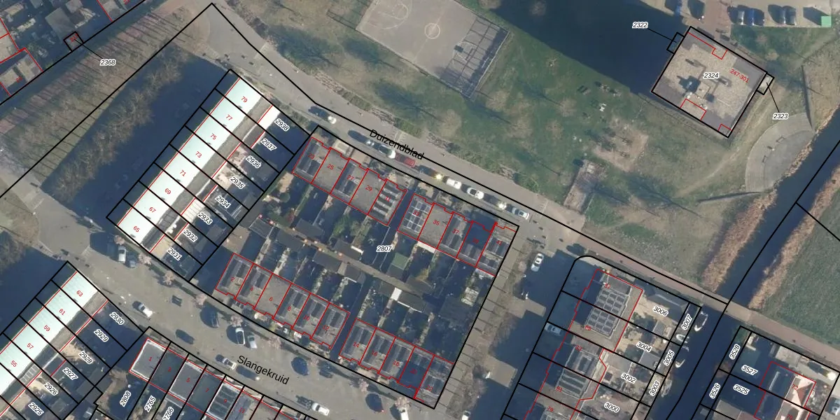 Het perceel waarop Duizendblad 33 staat heeft een oppervlakte van 2855 m². Dit is een zeer groot perceel. De perceeloppervlakte wordt geregistreerd door het Kadaster. Gedetailleerde informatie over de maten van dit perceel kunt u vinden in het rapport Kadastrale kaart met maatvoering van Duizendblad 33.