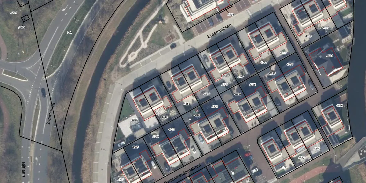 Erasmuslaan 26 is gelegen op kadastraal perceel KWK01C4853. Deze kadastrale aanduiding is uniek en wordt gebruikt door het Kadaster om eigendomsrechten en andere zakelijke rechten vast te leggen. Het perceel maakt onderdeel uit van de kadastrale gemeente Katwijk.