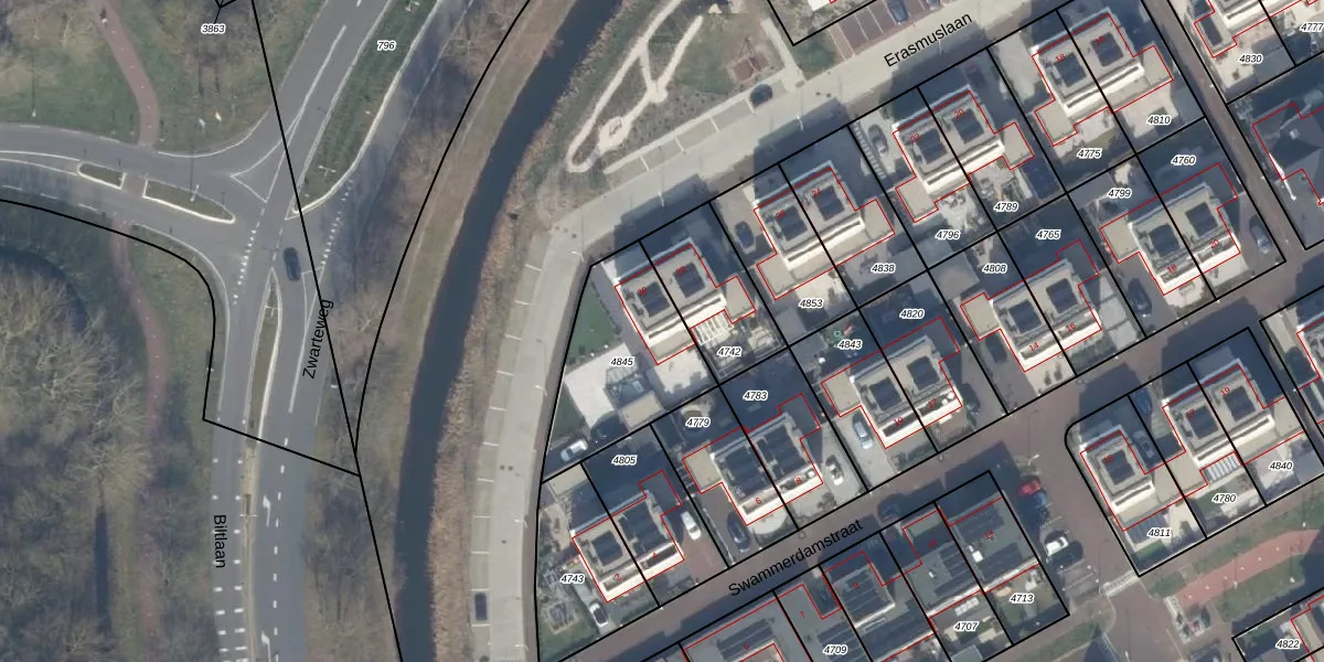 Erasmuslaan 30 is gelegen op kadastraal perceel KWK01C4845. Deze kadastrale aanduiding is uniek en wordt gebruikt door het Kadaster om eigendomsrechten en andere zakelijke rechten vast te leggen. Het perceel maakt onderdeel uit van de kadastrale gemeente Katwijk.