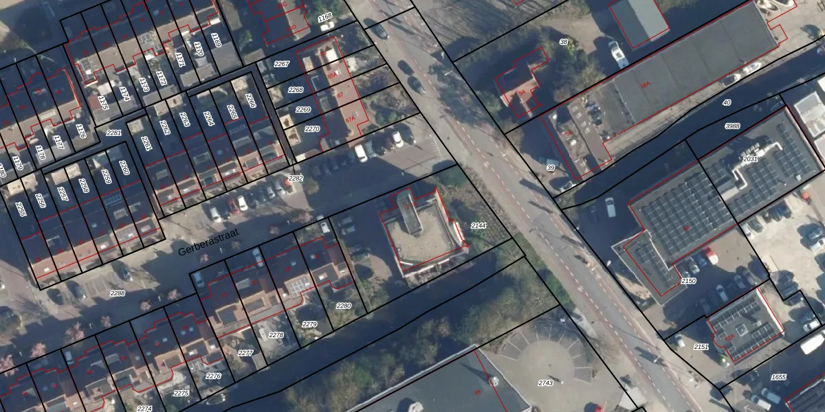 Het perceel waarop Gerberastraat 12 staat heeft een oppervlakte van 857 m². Dit is een groot perceel. De perceeloppervlakte wordt geregistreerd door het Kadaster. Gedetailleerde informatie over de maten van dit perceel kunt u vinden in het rapport Kadastrale kaart met maatvoering van Gerberastraat 12.