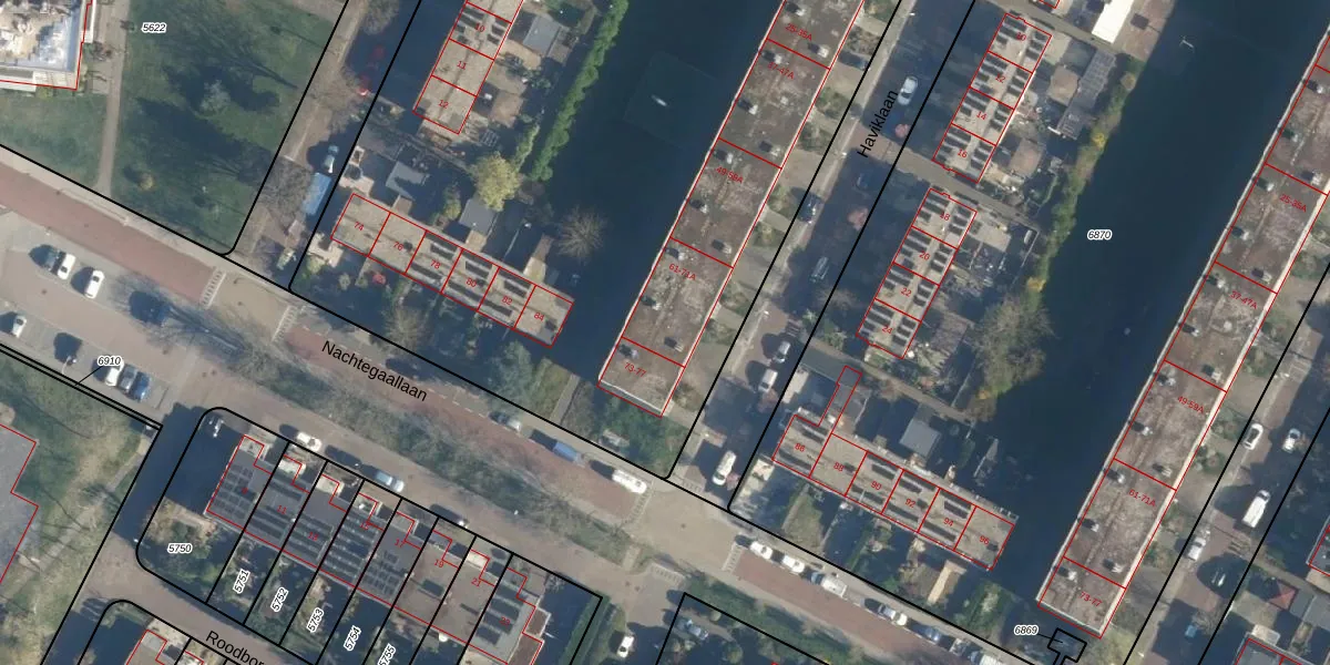 Het perceel waarop Haviklaan 69 staat heeft een oppervlakte van 7747 m². Dit is een zeer groot perceel. De perceeloppervlakte wordt geregistreerd door het Kadaster. Gedetailleerde informatie over de maten van dit perceel kunt u vinden in het rapport Kadastrale kaart met maatvoering van Haviklaan 69.