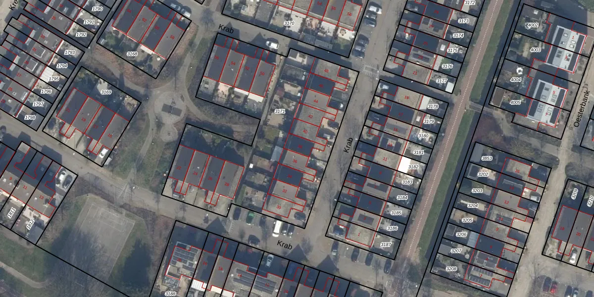 Het perceel waarop Krab 38 staat heeft een oppervlakte van 2565 m². Dit is een zeer groot perceel. De perceeloppervlakte wordt geregistreerd door het Kadaster. Gedetailleerde informatie over de maten van dit perceel kunt u vinden in het rapport Kadastrale kaart met maatvoering van Krab 38.