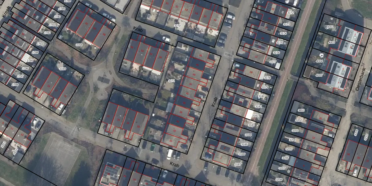 Het perceel waarop Krab 40 staat heeft een oppervlakte van 2565 m². Dit is een zeer groot perceel. De perceeloppervlakte wordt geregistreerd door het Kadaster. Gedetailleerde informatie over de maten van dit perceel kunt u vinden in het rapport Kadastrale kaart met maatvoering van Krab 40.