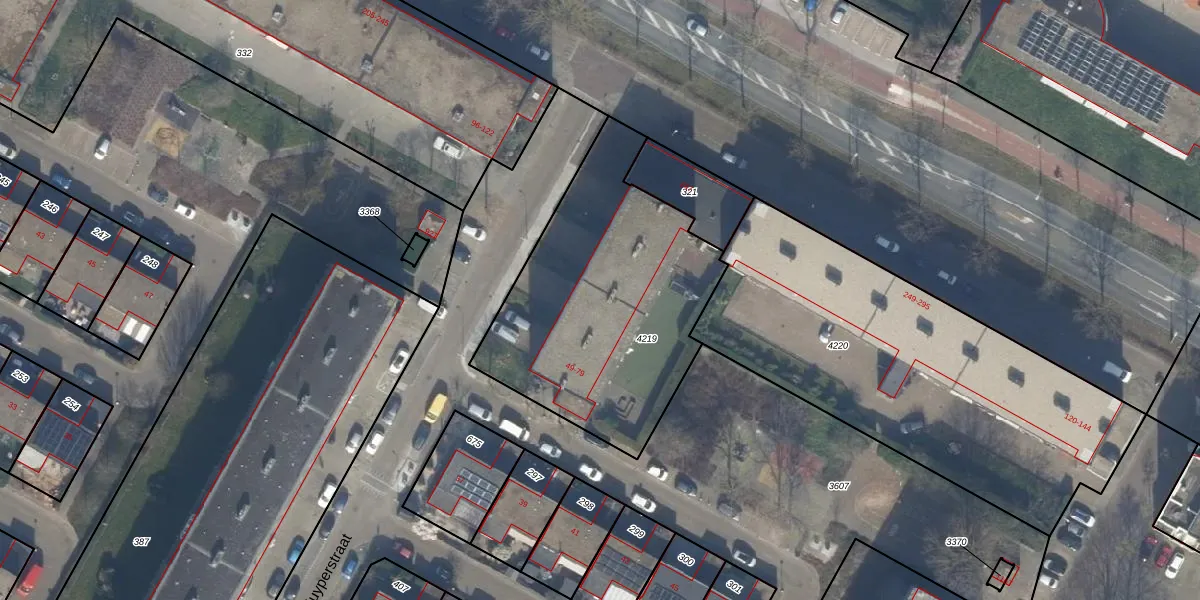 Het perceel waarop Kuyperstraat 55 staat heeft een oppervlakte van 1257 m². Dit is een zeer groot perceel. De perceeloppervlakte wordt geregistreerd door het Kadaster. Gedetailleerde informatie over de maten van dit perceel kunt u vinden in het rapport Kadastrale kaart met maatvoering van Kuyperstraat 55.