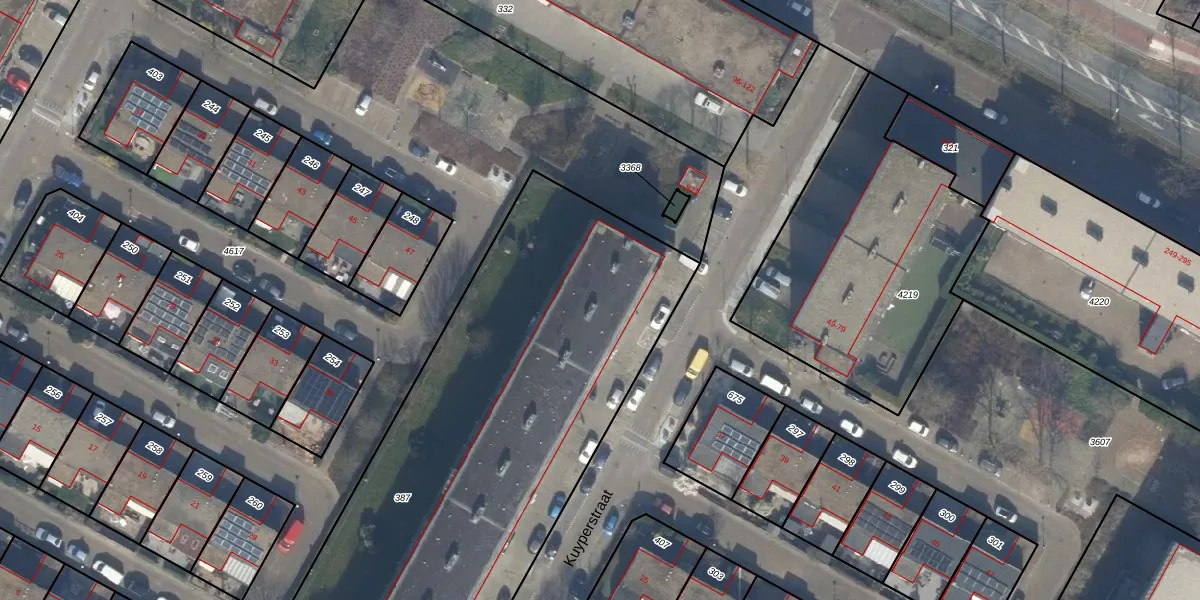 Het perceel waarop Kuyperstraat 56 staat heeft een oppervlakte van 3678 m². Dit is een zeer groot perceel. De perceeloppervlakte wordt geregistreerd door het Kadaster. Gedetailleerde informatie over de maten van dit perceel kunt u vinden in het rapport Kadastrale kaart met maatvoering van Kuyperstraat 56.