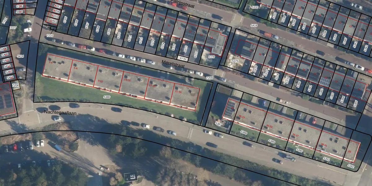 Het perceel waarop Merelstraat 21 staat heeft een oppervlakte van 2380 m². Dit is een zeer groot perceel. De perceeloppervlakte wordt geregistreerd door het Kadaster. Gedetailleerde informatie over de maten van dit perceel kunt u vinden in het rapport Kadastrale kaart met maatvoering van Merelstraat 21.