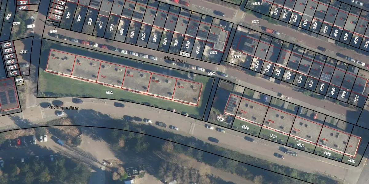 Het perceel waarop Merelstraat 24 staat heeft een oppervlakte van 2380 m². Dit is een zeer groot perceel. De perceeloppervlakte wordt geregistreerd door het Kadaster. Gedetailleerde informatie over de maten van dit perceel kunt u vinden in het rapport Kadastrale kaart met maatvoering van Merelstraat 24.