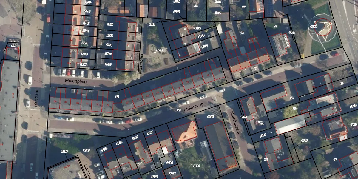 Het perceel waarop Molenweg 17 staat heeft een oppervlakte van 1525 m². Dit is een zeer groot perceel. De perceeloppervlakte wordt geregistreerd door het Kadaster. Gedetailleerde informatie over de maten van dit perceel kunt u vinden in het rapport Kadastrale kaart met maatvoering van Molenweg 17.