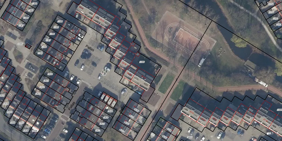 Het perceel waarop Pallas 43 staat heeft een oppervlakte van 1922 m². Dit is een zeer groot perceel. De perceeloppervlakte wordt geregistreerd door het Kadaster. Gedetailleerde informatie over de maten van dit perceel kunt u vinden in het rapport Kadastrale kaart met maatvoering van Pallas 43.