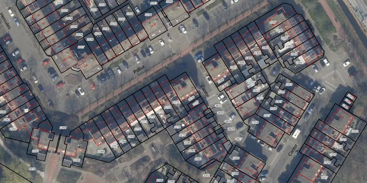 Het perceel waarop Pollux 39 staat heeft een oppervlakte van 177 m². Dit is een middelgroot perceel. De perceeloppervlakte wordt geregistreerd door het Kadaster. Gedetailleerde informatie over de maten van dit perceel kunt u vinden in het rapport Kadastrale kaart met maatvoering van Pollux 39.