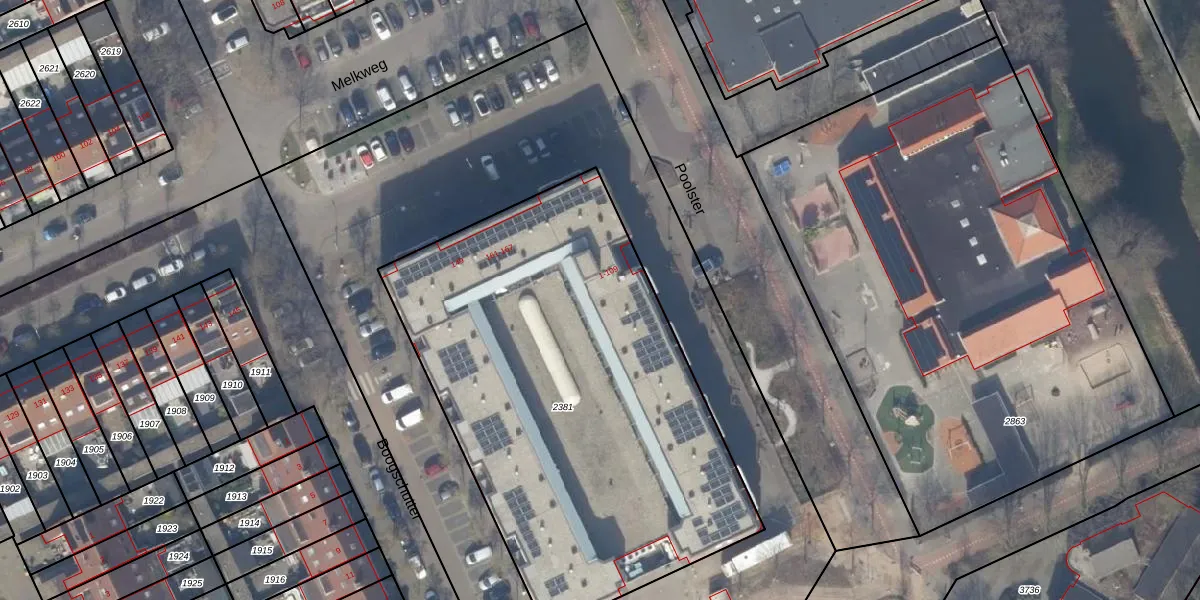 Het perceel waarop Poolster 35 staat heeft een oppervlakte van 2675 m². Dit is een zeer groot perceel. De perceeloppervlakte wordt geregistreerd door het Kadaster. Gedetailleerde informatie over de maten van dit perceel kunt u vinden in het rapport Kadastrale kaart met maatvoering van Poolster 35.