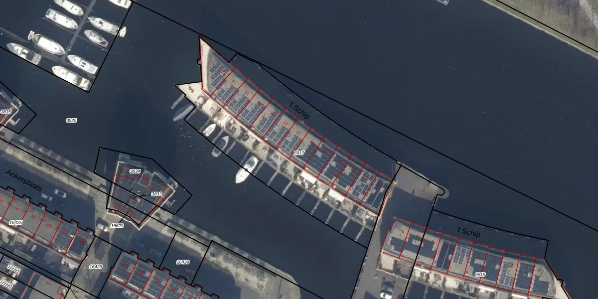 Het perceel waarop 't Schip 16 staat heeft een oppervlakte van 2255 m². Dit is een zeer groot perceel. De perceeloppervlakte wordt geregistreerd door het Kadaster. Gedetailleerde informatie over de maten van dit perceel kunt u vinden in het rapport Kadastrale kaart met maatvoering van 't Schip 16.
