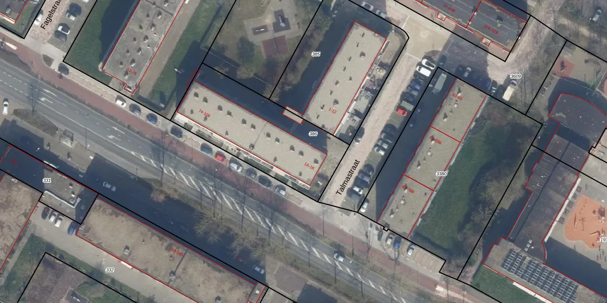 Talmastraat 1-B is gelegen op kadastraal perceel KWK01C386. Deze kadastrale aanduiding is uniek en wordt gebruikt door het Kadaster om eigendomsrechten en andere zakelijke rechten vast te leggen. Het perceel maakt onderdeel uit van de kadastrale gemeente Katwijk.
