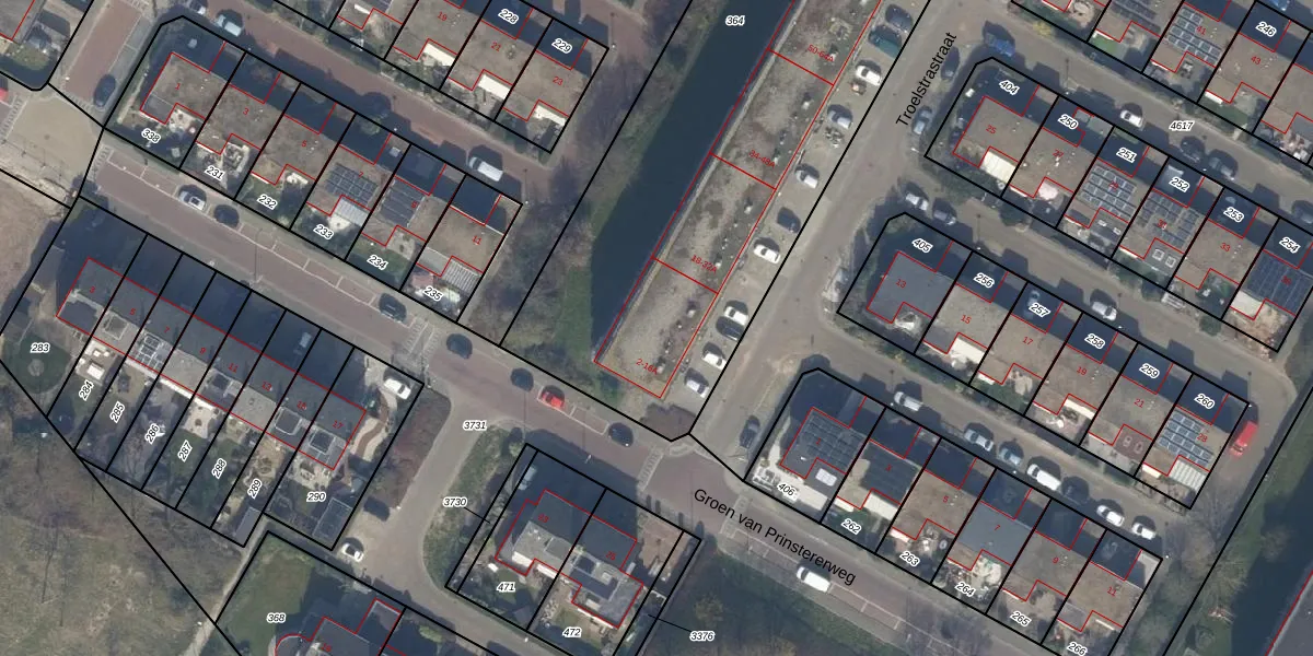 Het perceel waarop Troelstrastraat 2-B staat heeft een oppervlakte van 3685 m². Dit is een zeer groot perceel. De perceeloppervlakte wordt geregistreerd door het Kadaster. Gedetailleerde informatie over de maten van dit perceel kunt u vinden in het rapport Kadastrale kaart met maatvoering van Troelstrastraat 2-B.