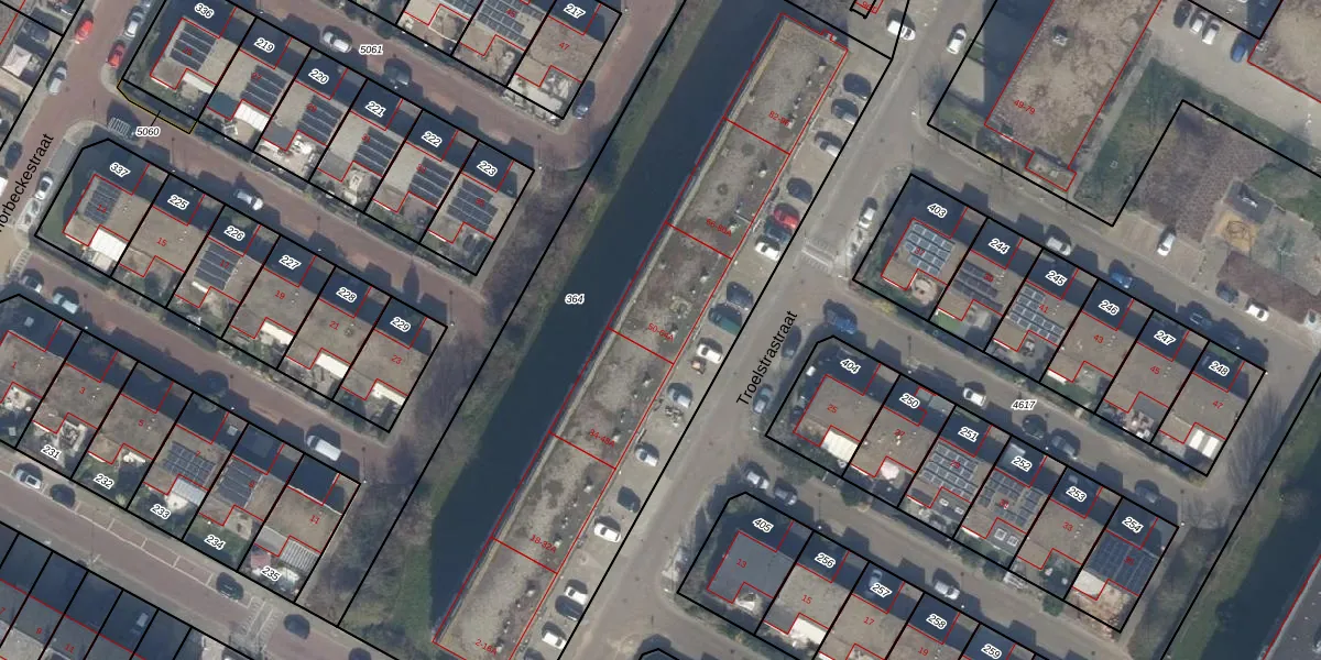 Het perceel waarop Troelstrastraat 56 staat heeft een oppervlakte van 3685 m². Dit is een zeer groot perceel. De perceeloppervlakte wordt geregistreerd door het Kadaster. Gedetailleerde informatie over de maten van dit perceel kunt u vinden in het rapport Kadastrale kaart met maatvoering van Troelstrastraat 56.
