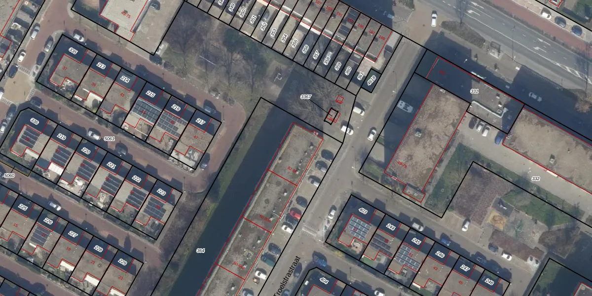 Het perceel waarop Troelstrastraat 96 staat heeft een oppervlakte van 3685 m². Dit is een zeer groot perceel. De perceeloppervlakte wordt geregistreerd door het Kadaster. Gedetailleerde informatie over de maten van dit perceel kunt u vinden in het rapport Kadastrale kaart met maatvoering van Troelstrastraat 96.